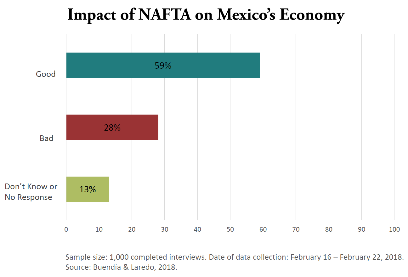 This is a somewhat surprising and very important finding. Despite the often-dire predictions commonly seen in the media about the direction of the NAFTA talks, Mexicans remain optimistic. This may well be testament to the fact that Mexican government officials are controlling the narrative around NAFTA given that the other potential opinion leaders, the presidential candidates, have focused their rhetoric on domestic policy and personal attacks.